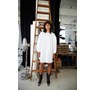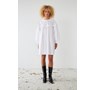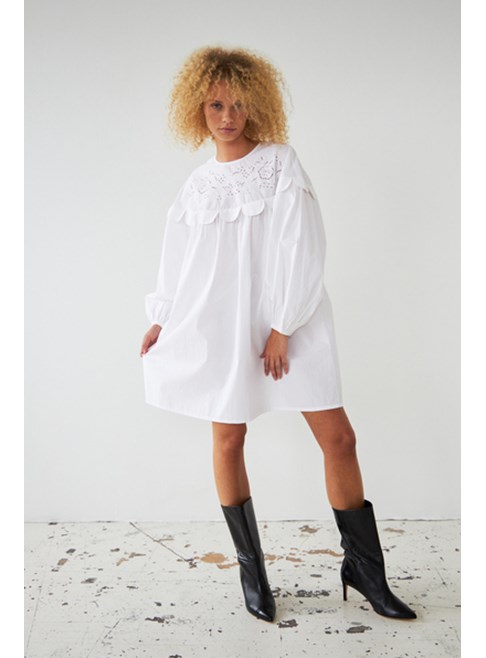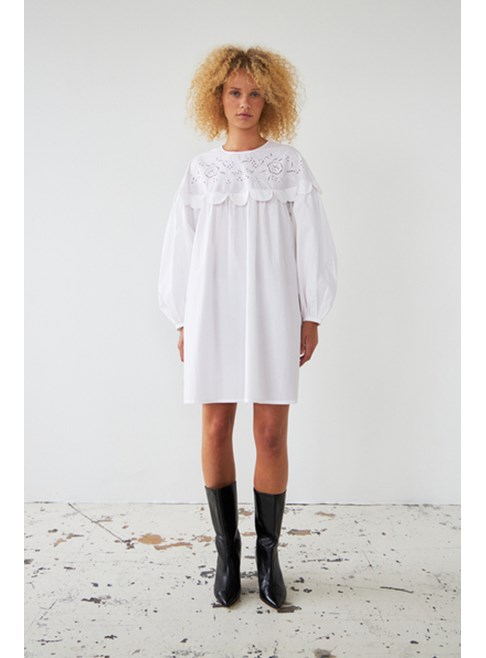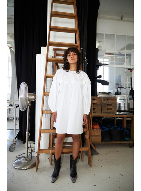 Embroidery Anglaise mini dress from Stella Nova with long sleeves. Round neck and "tongue" details. The dress has a feminine string closure in the neck, which leaves an open back. Elastic cuffs and slightly voluminous sleeves. 100% cotton.