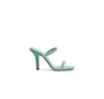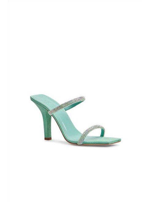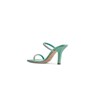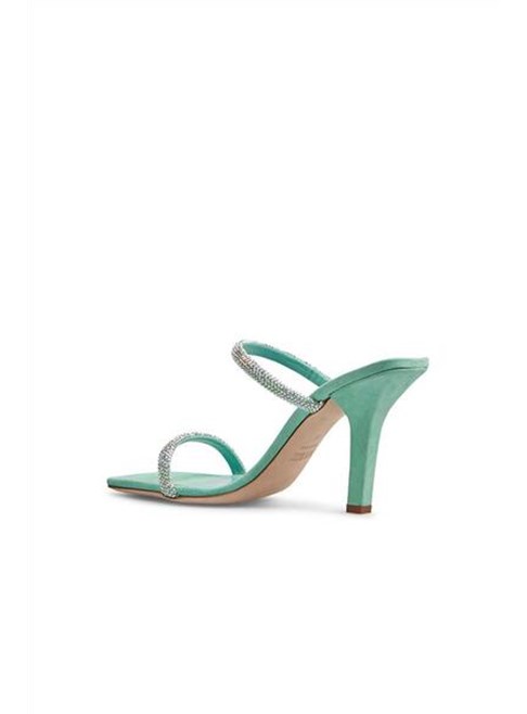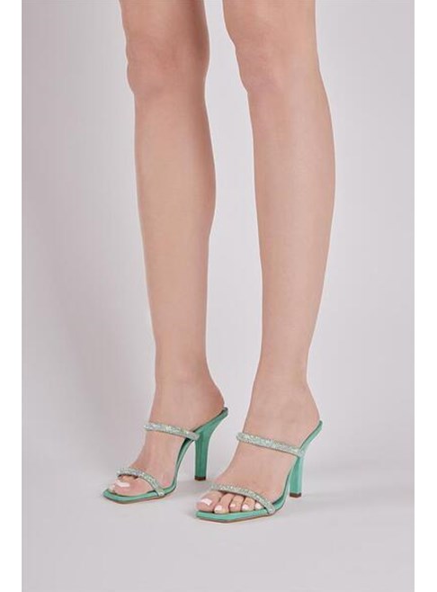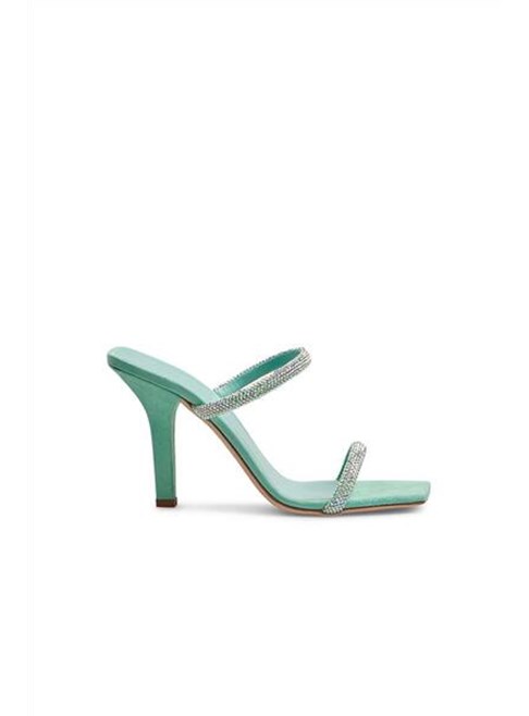 Aquamarine green leather Holly Linda embellished mules from Paris Texas featuring crystal embellishment, double-strap design, open toe, high heel, slip-on style and branded leather insole. Memorable nights start with these heels. Made in Italy from suede. Pair with your party dress or favorite jeans.
