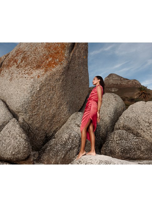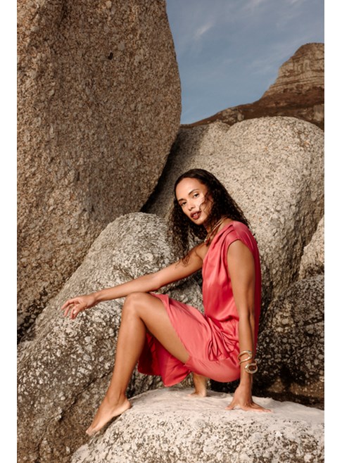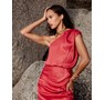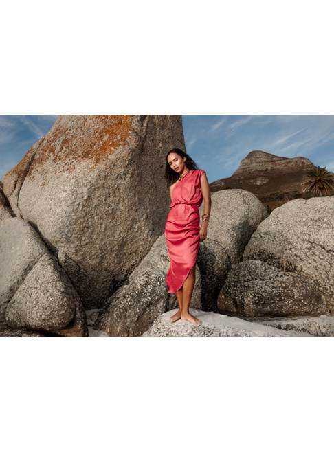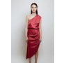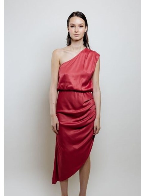 Raspberry pink one-shoulder dress from Livthelabel. Comes in viscose, with assymetric skirt. Midi length.