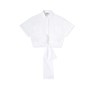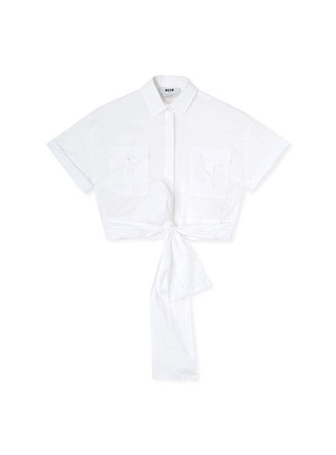 Solid color poplin short-sleeve cropped shirt with bow from MSGM. Sashed waist. Flapped pockets.