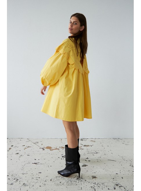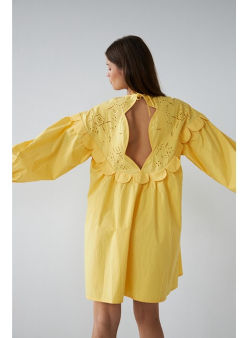 Embroidery Anglaise mini dress with long sleeves from Stella Nova. Round neck and "tongue" details. The dress has a feminine string closure in the neck, which leaves an open back. Elastic cuffs and slightly voluminous sleeves. 100% cotton.