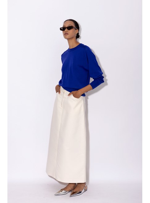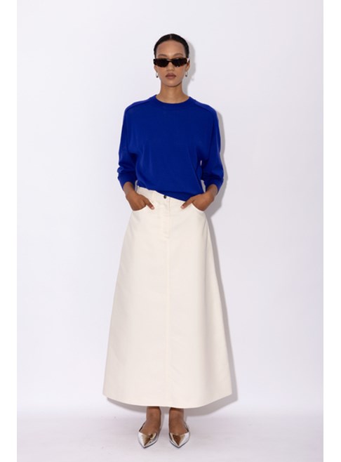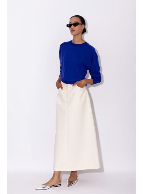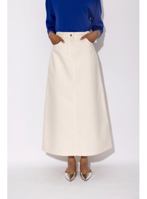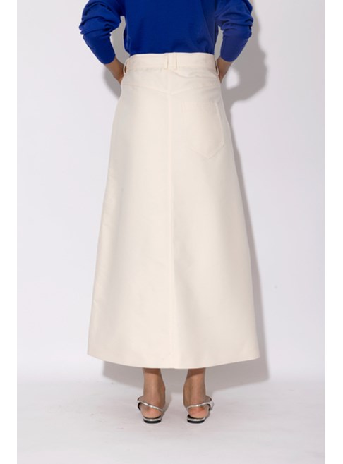 An A-line long skirt in a crispy cotton fabric from Collectors Club sourced in Japan. A fabric to die for, honestly. Front zipper and metallic button, two side pockets and one back pocket. Wear a turtleneck or a plain white t-shirt on top, a knit or an oversized blazer. Easy to pair piece.