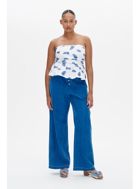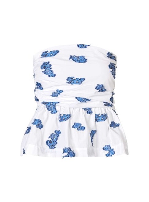 This strapless, cropped top from Baum und Pferdgarten features a peplum silhouette and stretchy smocking at the back. There is a zip closure at the side and jacquard detailing throughout the top.