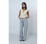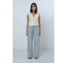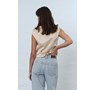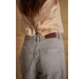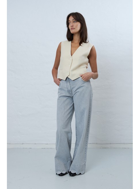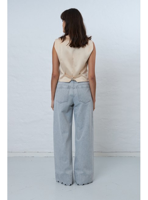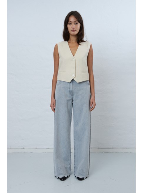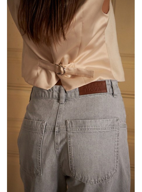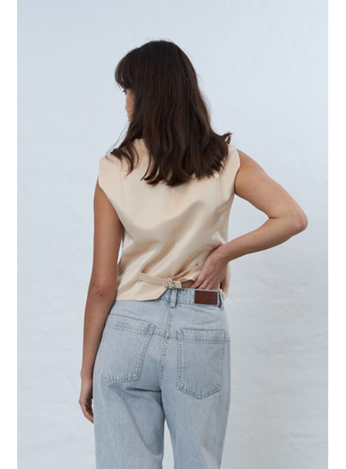 A tailored tuxedo vest from Stella Nova with buttons is woven and made in an elegant linen blend. It is short and has a satin panel on the backside. The STELLA NOVA logo is on the lining. The vest has small, decorative pockets and a buckle on the back for a fitted waist.