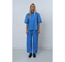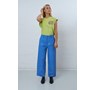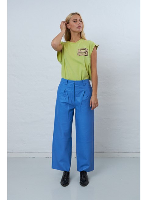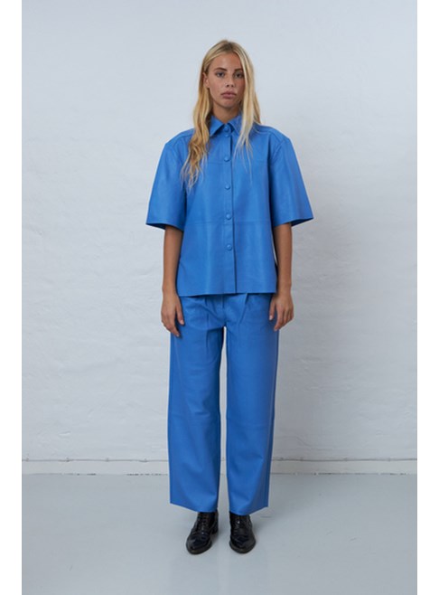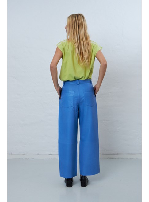 Cropped leather pants from Stella Nova with straight legs and a loose fit. The pants have belt loops, hidden side pockets and open back pockets. Press button -and zipper closure.