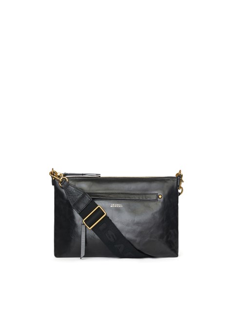 Shoulder bag in calfskin leather. Carried by hand or crossbody style. Adjustable and removable woven handle with "Marant" logos and engraved snap hooks.