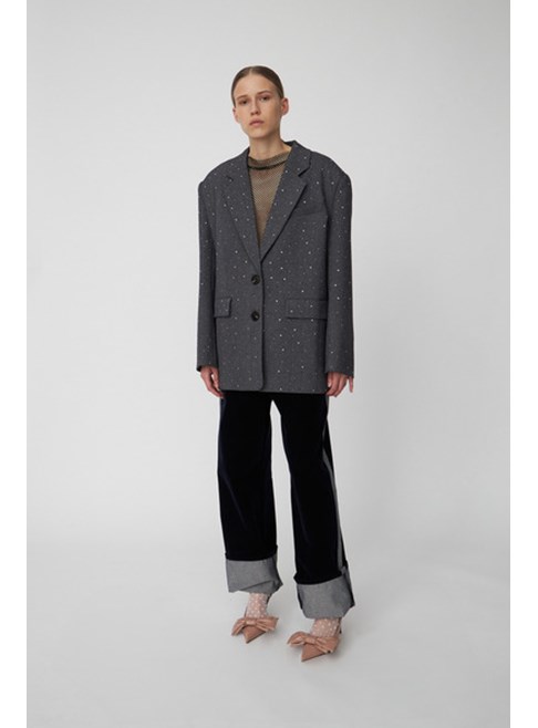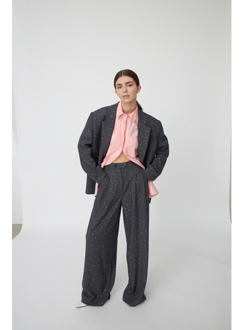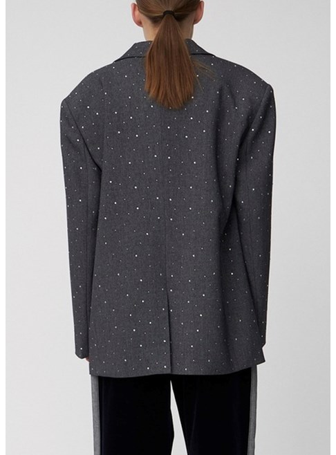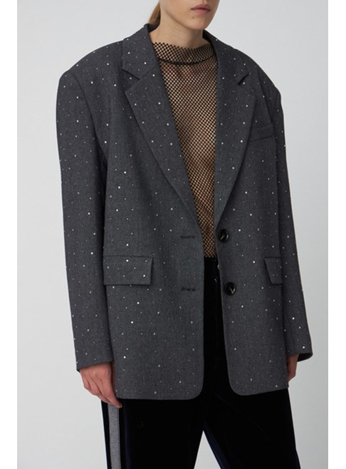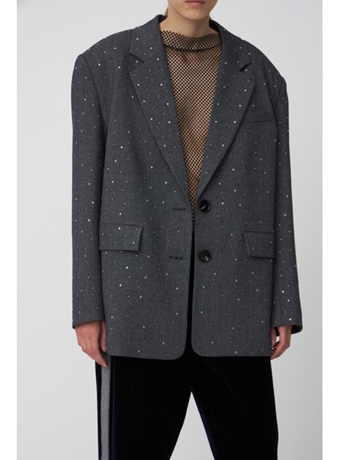 Oversized blazer from Stella Nova in a classic grey tone, embellished with small rhinestones throughout the fabric. The blazer features wide notched lapels and fastens with two front buttons. It includes two side flap pockets and a chest pocket. The jacket has a relaxed fit with shoulder pads, and a back vent for ease of movement. Combine with our matching Rhinestone suiting pants.