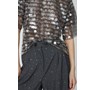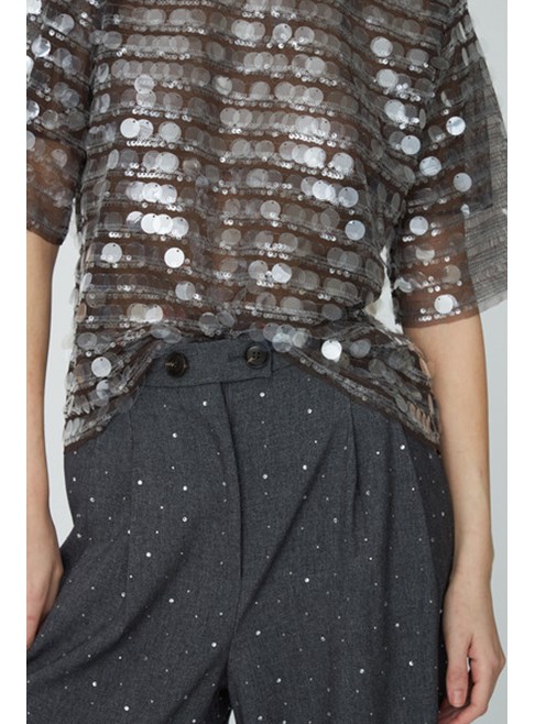 Wide-leg Stella Nova trousers with a relaxed fit, adorned with rhinestones throughout the fabric. The trousers feature a high waist with double button details and belt loops. Front pleats add extra volume and movement. They fasten with a zipper and buttons at the waist and include side pockets. Combine with our matching Rhinestone suiting blazer or your favorite white shirt.