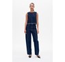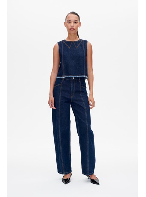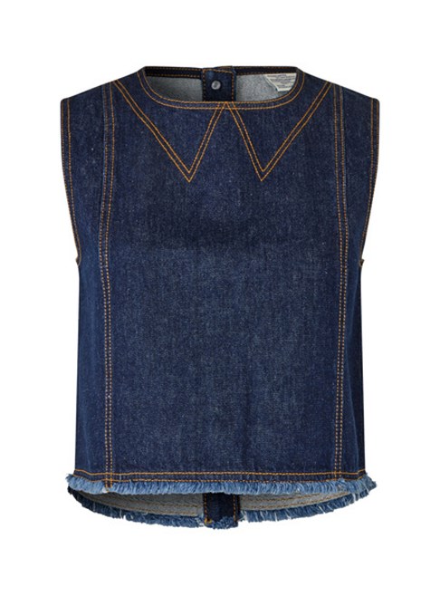 This cropped, sleeveless denim Madi top from Baum und Pferdgarten features button closures in the back and contrast stitching in the shape of a collar at the neck. The top has a frayed hemline and is made from organic cotton. Night sky denim.