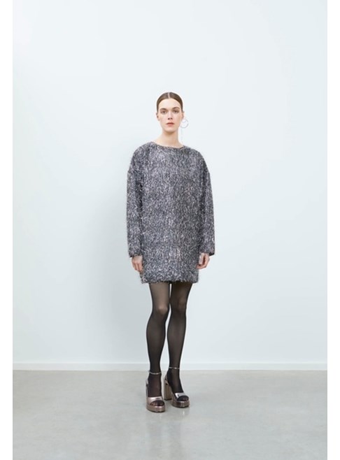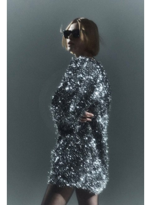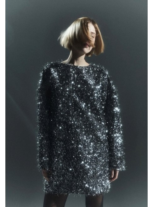 The Alexia Dress by Rhune, adorned with glitter, features long sleeves and a relaxed fit. Pair it with elegant heels for a dazzling evening look.