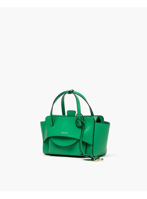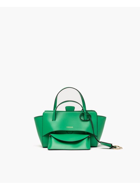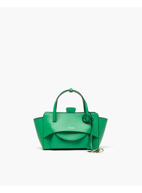 This is our Flap S bag by Hidesins. It's a grass green crossbody bag crafted in smooth calf leather. The bag has an adjustable and removable strap to wear it cross-body.