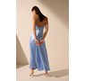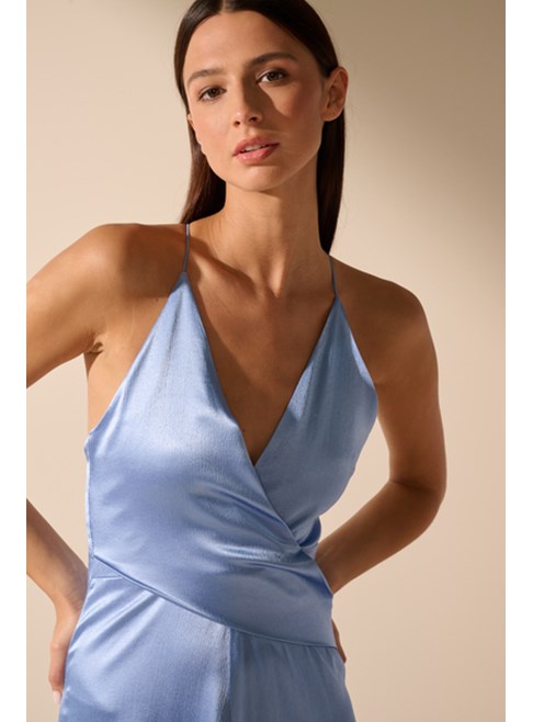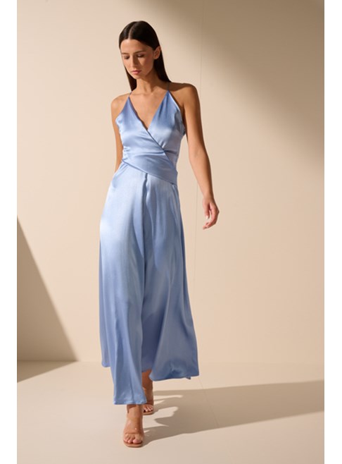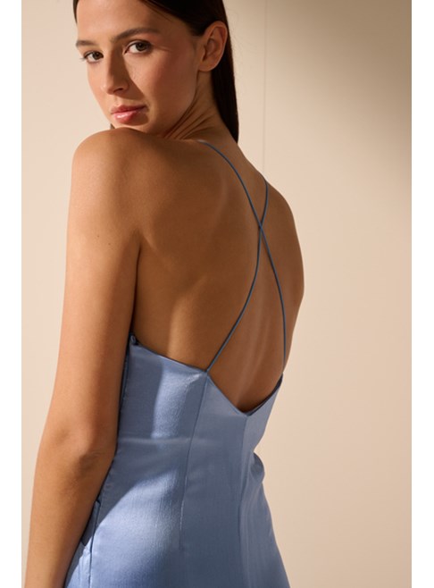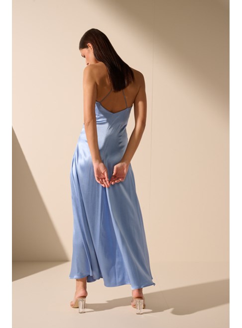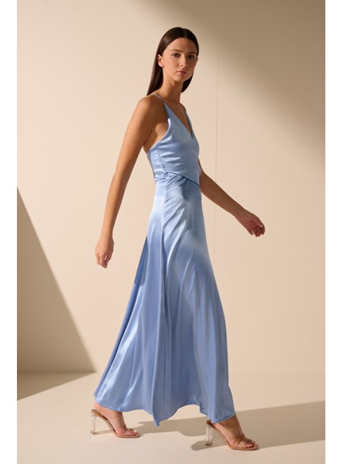 This is our Rover dress by Oscar. It's a V-neck maxi dress with fitted silhouette and open back.
