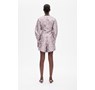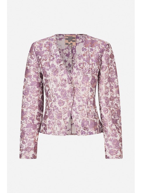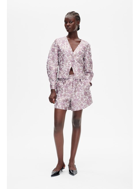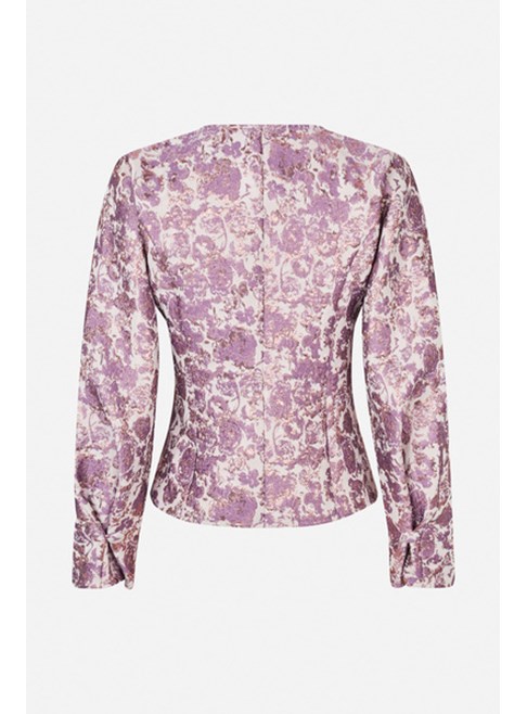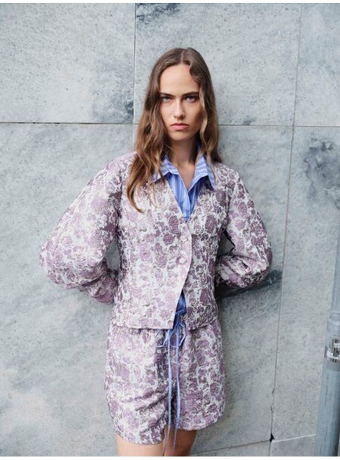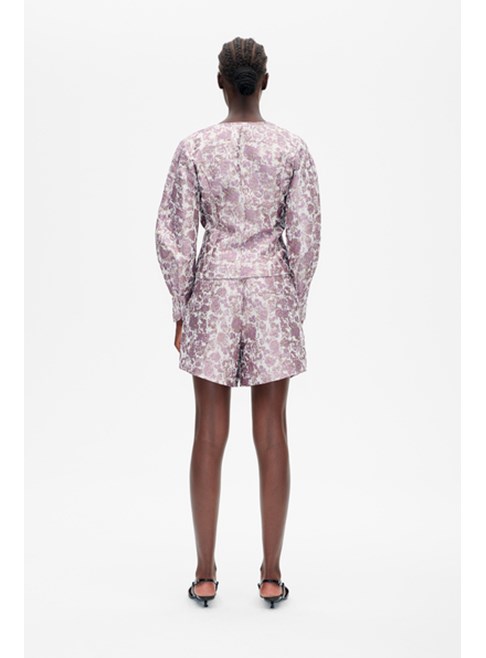 The Milie Blouse by Baum und Pferdgaerten is crafted from structured jacquard fabric with metallic threading, creating a sophisticated shimmer and a bold, statement-making design. Its fitted silhouette and V-neck offer a flattering, polished look, while voluminous sleeves add a dramatic flair. The button closure on the front ensures a timeless finish. Pair the Milie Blouse with our Nela Shorts and heels for an elevated evening ensemble, or style it with high-waisted jeans and sneakers for a chic, casual vibe.