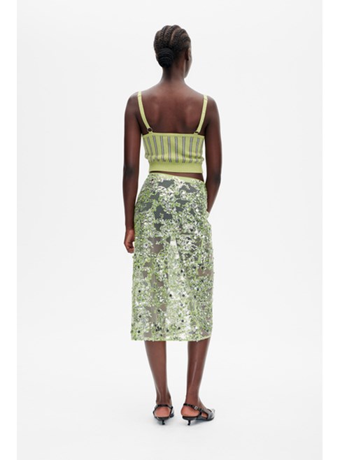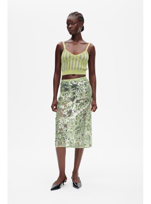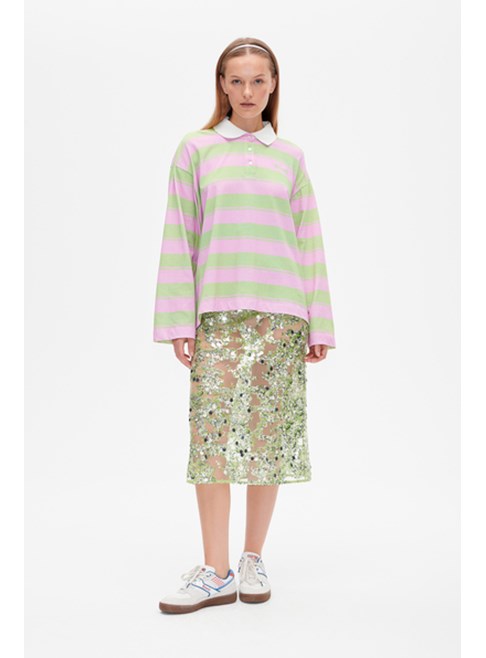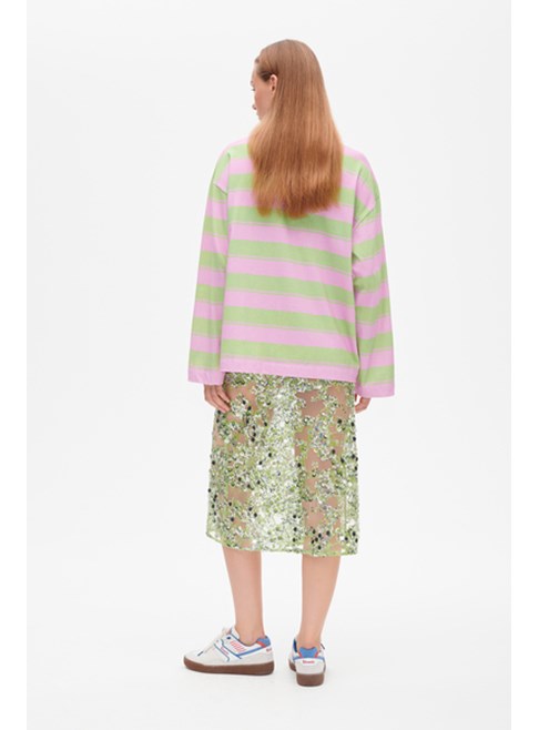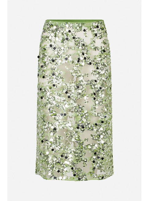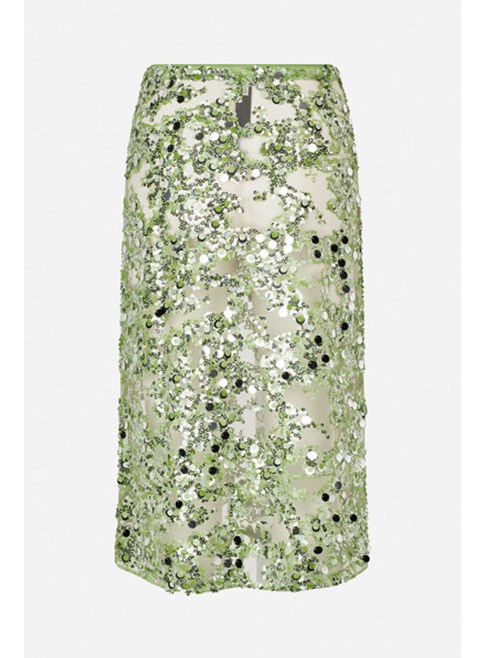 The Shania Sequin Skirt by Baum und Pferdgarten is a midi-length, high-waist, transparant design that combines bold glamour with modern elegance. Featuring an all-over sheer, unlined sequin design, it creates a striking and eye-catching look. The elasticated waistband ensures comfort and a secure fit, making it perfect for special occasions or statement-making outfits. The skirt is see-through, so combine it with an oversized white shirt like our Ancia shirt.