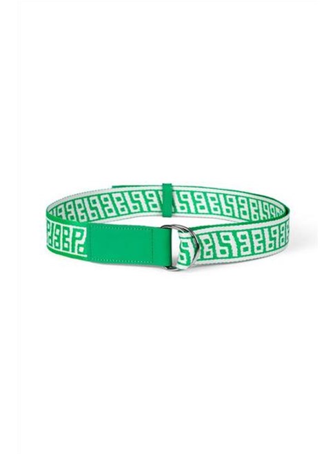 A textile belt with a D-ring closure. The belt features a repeating "BP" logo. - This piece is from our Pre-Autumn 2022 collection