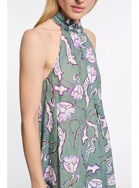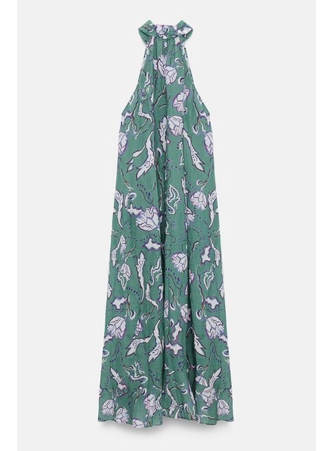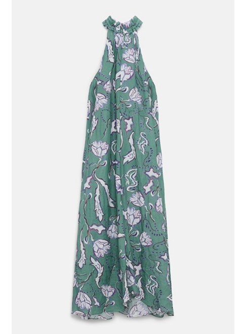 The maxi dress is made from crinkle-effect printed ramie and has an elastic halter neckline with ruffles. The dress has a drapey, relaxed fit and voluminous skirt.