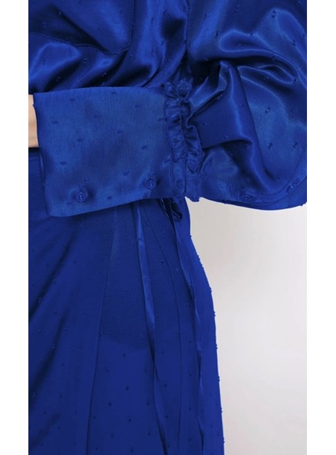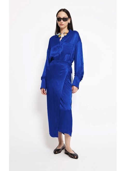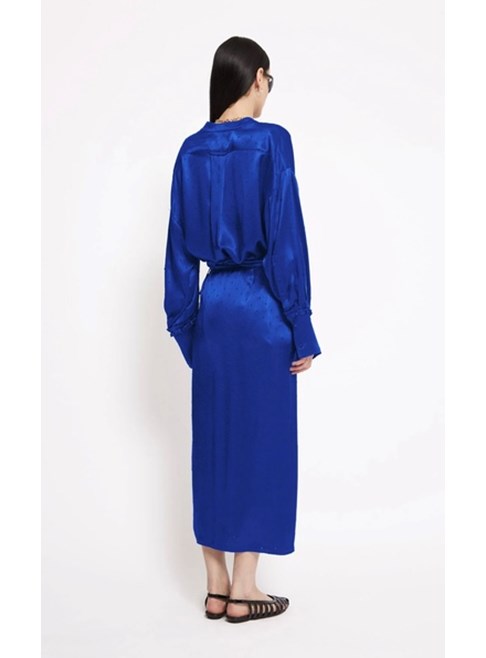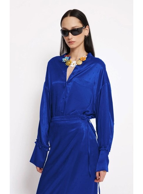 Made from perforated viscose jacquard, this piece highlights a satin worked on its right side, revealing all the shine and brilliant intensity of the material.