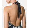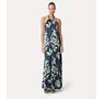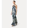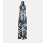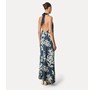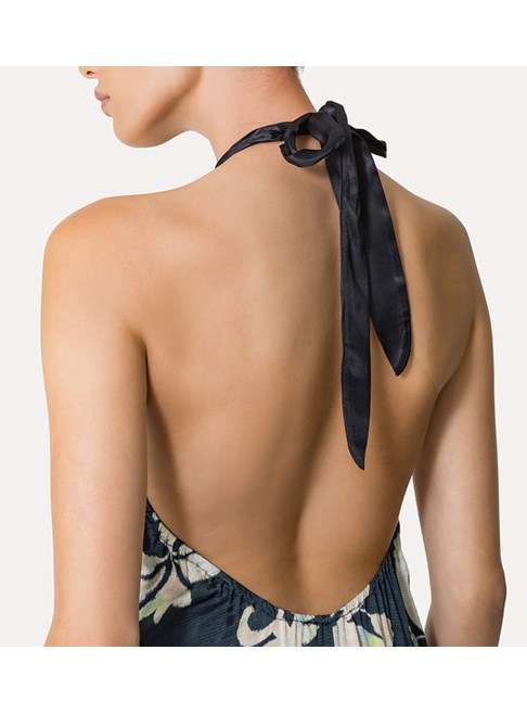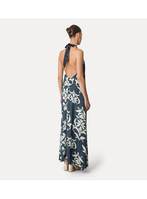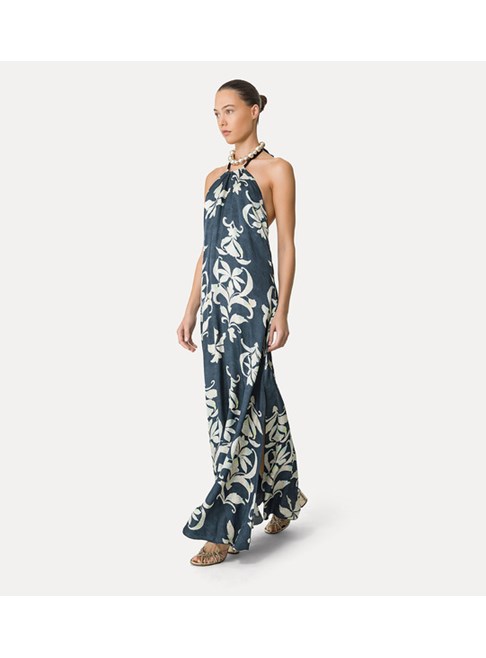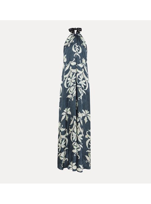 Dress in viscose satin with a halterneck design enhanced by contrasting silk ties to be knotted at the nape of the neck. The rich patterning evokes ocean depths and lily flowers that nod to pure feminine symbols. flowing into a flare, the satin dress will be a perfect match to seashell bijoux and mother-of-pearl earrings with an aesthetic that is halfway between the sea and the sky.