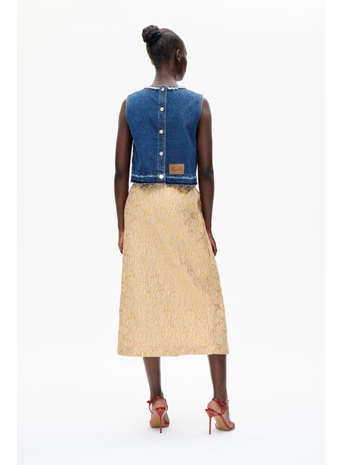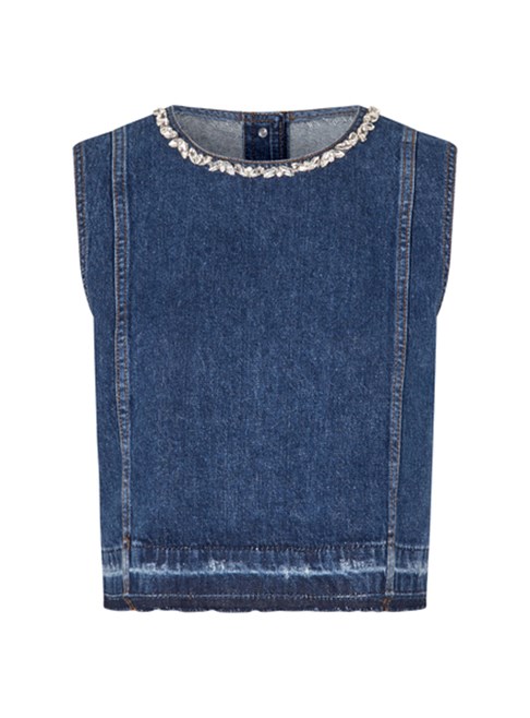 The Medine Top by Baum und Pferdgarten is a fresh take on classic denim, as the bejeweled neckline gives it a touch of glamour. The sleeveless denim top is made in organic cotton and has a cropped and relaxed fit that makes it easy to style with your everyday wardrobe. Wear it with our matching jeans or a skirt for a chic and modern look.
