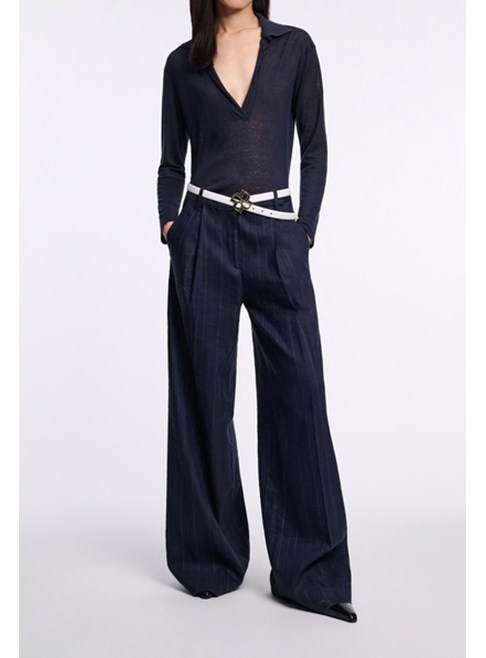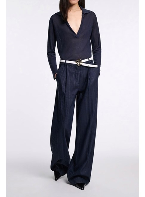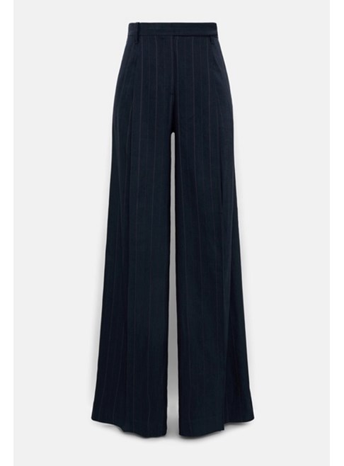 The new suiting is (pin)striped: Crafted in a linen blend, the pinstripe pants feature front pleats and a wide leg. The pants can be worn as part of a suit with the matching shell and blazer.