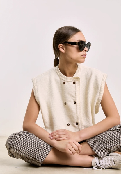 Think of it as the power piece you didn't know you needed: a sleeveless wool cardigan by Studio Clique loaded with quiet confidence. The double-breasted closure nods to classic tailoring, yet its soft knit keeps the mood effortless. It's that rare hybrid: structured enough for the boardroom, relaxed enough for Sunday coffee.The straight, relaxed fit allows for layering over shirts, blouses, or t-shirts.