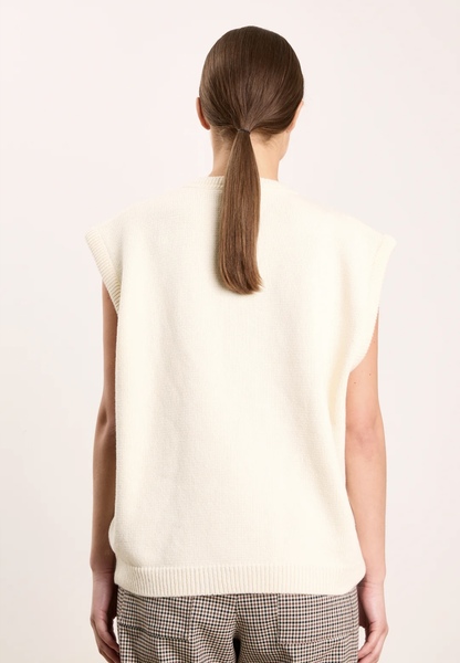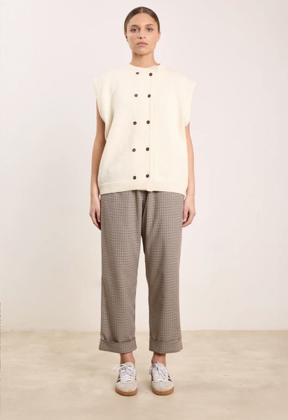 Max is knitted from a wool-polyamide blend yarn. It features a double-breasted front with small round buttons in a contrasting dark tone, for a modern, structured look. The ribbed crew neckline, armholes, and hem provide subtle structure and prevent stretching over time.