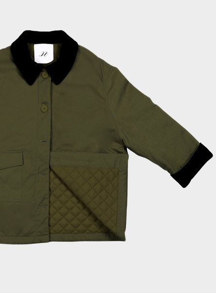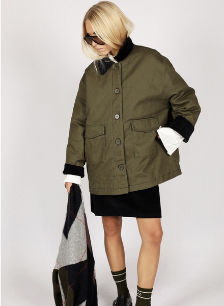 Our Boris coat by Noted Antwerp in khaki is a fall winter staple. Featuring a corduroy navy collar and double patched pockets.