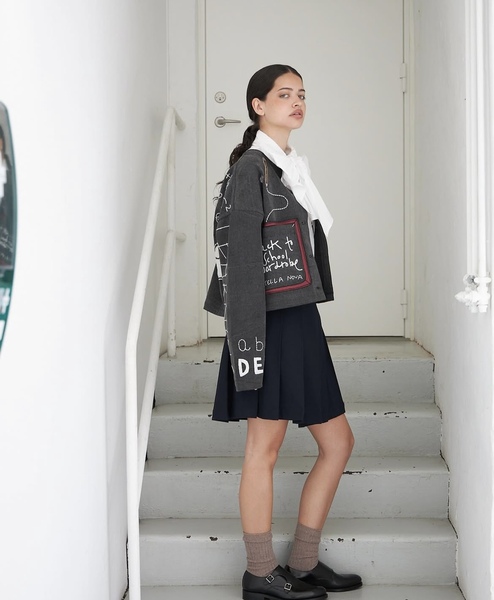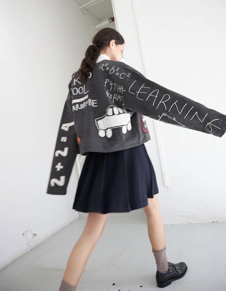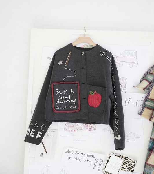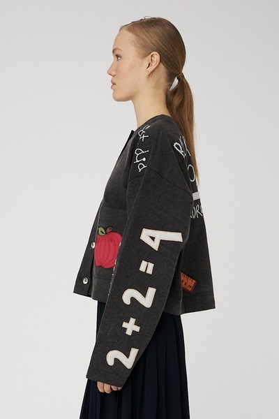 Jacket by Stella Nova with embroidered school class-inspired motifs on the front, back, and sleeves. The jacket is closed with buttons and loops in the center front. Matching pants available.