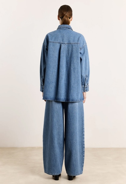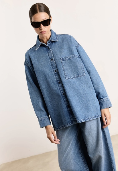 Vicky is a long-sleeved shirt crafted from structured mid-weight cotton denim. It features dropped shoulders and relaxed fit, button-down front with tonal stitching and matte black buttons. One chest patch pocket. Back yoke with soft pleating for added volume. Straight hem, slightly longer at the back.