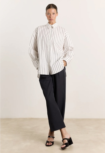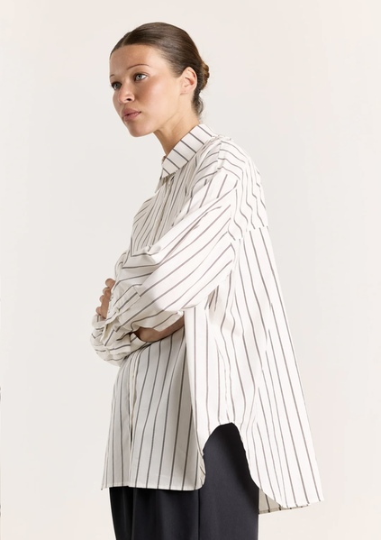Meet Laura, your new favorite shirt by Studio Clique. The crisp poplin fabric and subtle print create a clean, structured look, while the dropped shoulders and curved hem bring ease to its shape. Ideal for layering or wearing solo. Available in White/Brown.