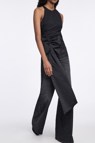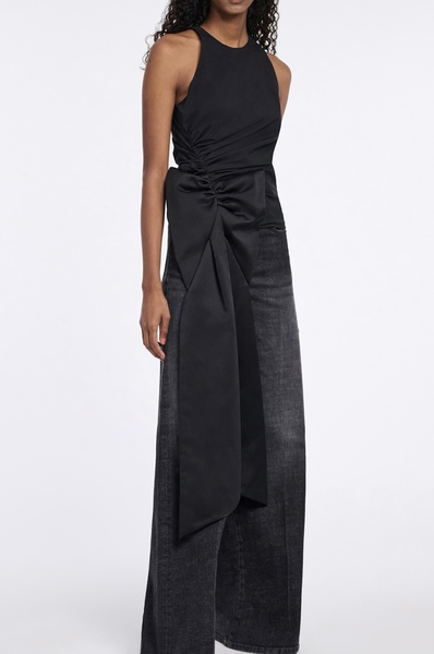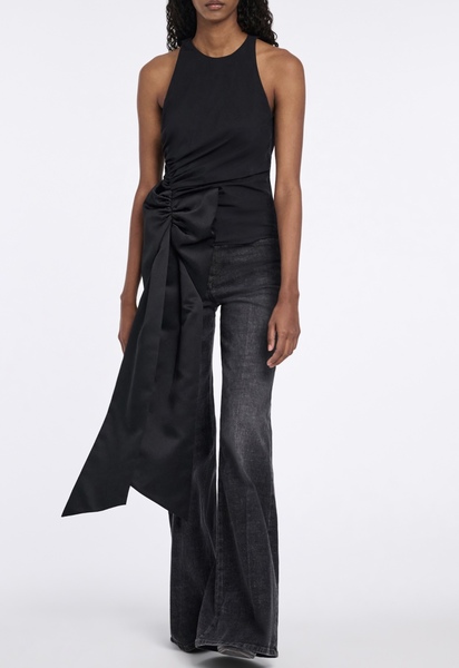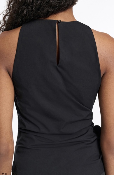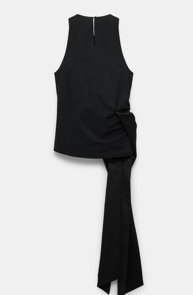 Memorable comes to mind. The sleeveless top is cut in cotton-poplin and features soft draping and an XL satin bow at the hip. The top has a round neckline and button closure at the nape.