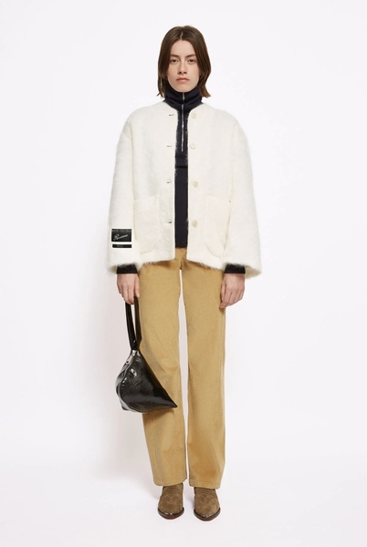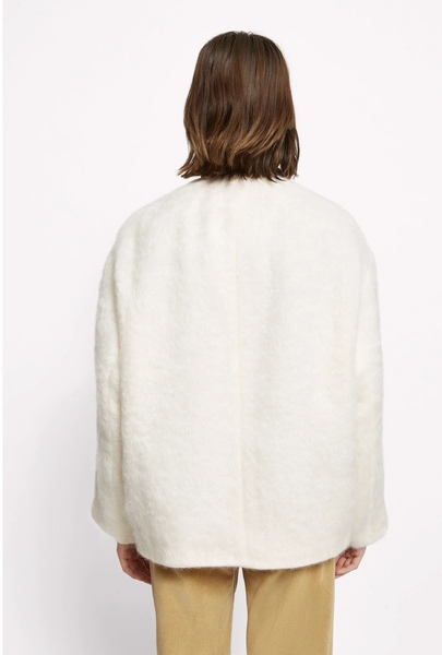 Loose-fitting mohair jacket with no collar. It fastens with engraved mother-of-pearl buttons and has two patch pockets on the front. The interior is fully lined.