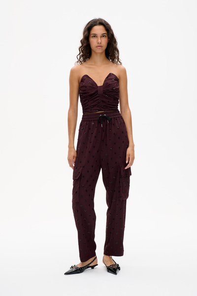 The Meila Top by Baum und Pferdgarten is a statement piece with sweetheart neckline and flower-shaped sequins. The top has a fitted silhouette with soft gatherings for added shape. Shirring at the back ensures a snug and comfortable fit.