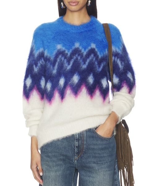 The Ambre Sweater from Marant Étoile combines a slightly oversized crew neck with a Nordic geometric-inspired pattern, finished in a striking blue palette and a soft, fluffy yarn for a statement layer that works for both everyday and formal occasions.