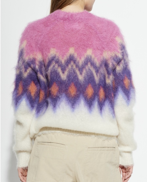 Key Features: Pink | Purple | Orange | White | Mohair and wool | Soft, fluffy texture | Insulating warmth | Ribbed cuffs | Stretch fabric | Crew neck | Dropped shoulders | Fair Isle Norwegian pattern | Geometric motifs | Ribbed hem and cuffs | Fluffy, hairy knit texture |
