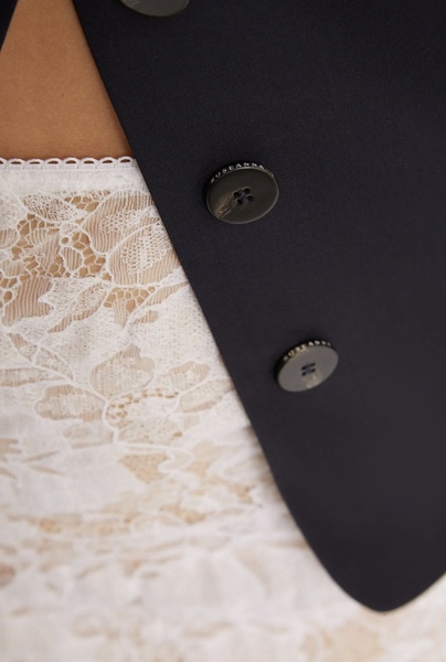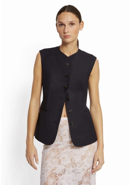 A sleeveless vest with a fitted cut and defined waist, welt pockets, and tone-on-tone engraved buttons.